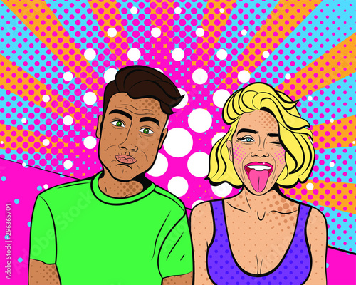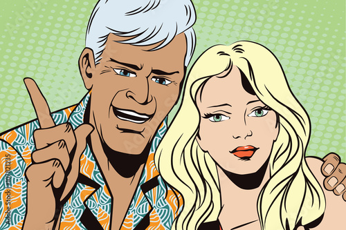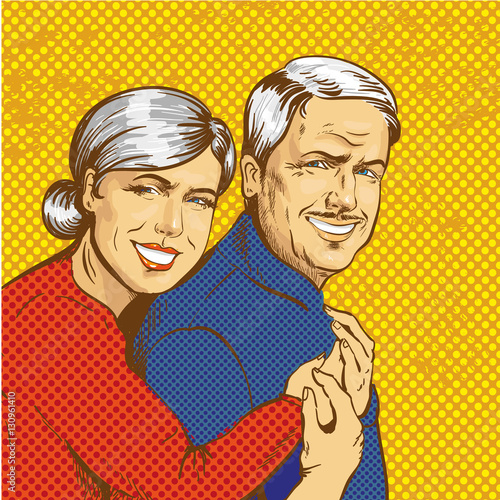 Vektorové ilustrace usmívající se zralý pár v retro pop art komiks styl. Šťastný rodinný koncept.