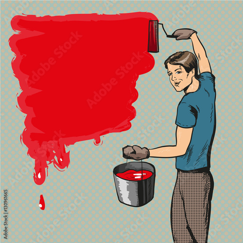 Vektorová ilustrace malíře domu s malířským válečkem a kbelíkem barvy v retro pop art komickém stylu. Profese malířského konceptu stěn a štětců.