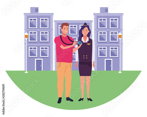 Street food concept vektorová ilustrace v plochém stylu. Mladý muž a žena stojící u stánku s jídlem v parku.
