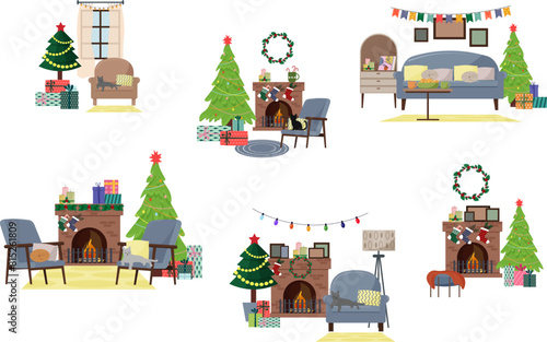 Vektorová sada plakátů, bannerů na silvestrovské oslavy. Prskavky, ohňostroje, vánoční stromek a novoroční designové prvky v plochém stylu.
