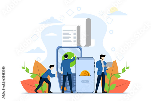 Vektorová ilustrace osob provádějících operace se samoobslužným terminálem. Bankovní a technologický koncept designový prvek v plochém stylu
