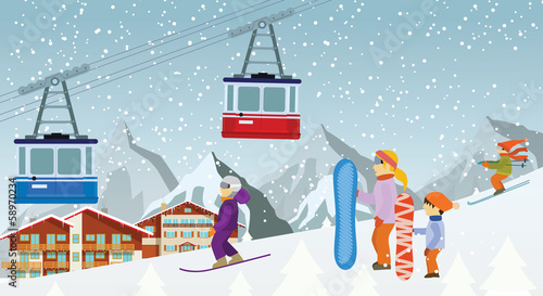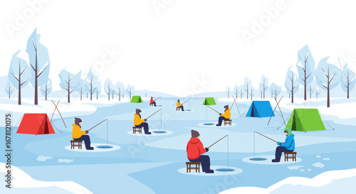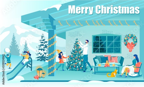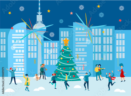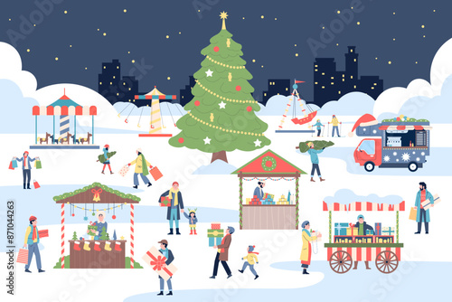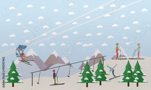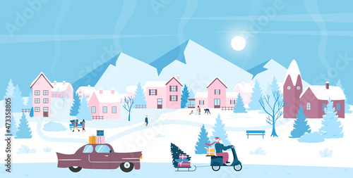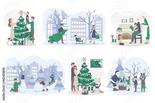Vektorová ilustrace mladého muže, který čistí auto a odhazuje sníh, pár chodí po ulici a dívka krmí ptáky. Zimní lidé aktivity koncept designové prvky v plochém stylu.