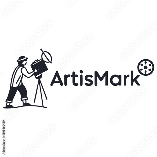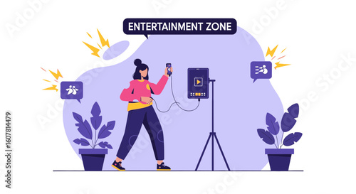 Vektorová ilustrace scénáře čtení producenta. Producent nahrávek, charakter produkčního ředitele. Digitální videokamera na stativu. Kinematografie koncept designový prvek v plochém stylu.