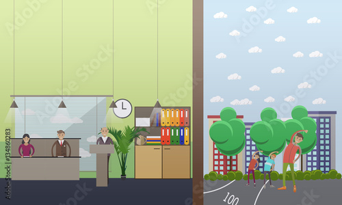 Vektorová ilustrace univerzitního profesora, staršího muže se studenty. Přednáška, Seminář. Vysokoškolský koncept designový prvek v plochém stylu.