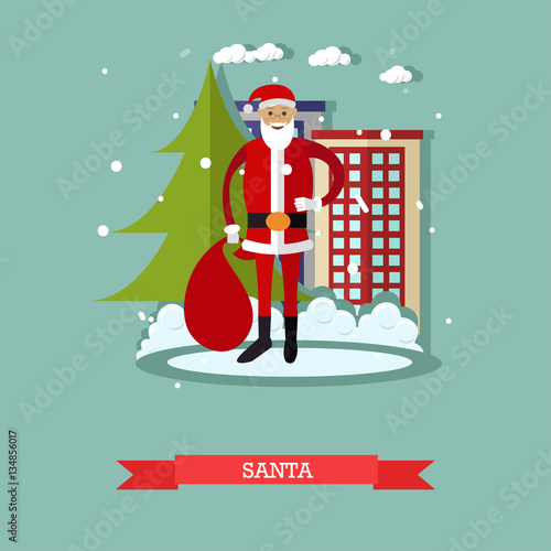 Vektorová ilustrace Santa Clause s pytlem plným dárků. Sněží. Zimní Panoráma města. Animace. Veselé Vánoce a Šťastný Nový rok designový prvek v plochém stylu.