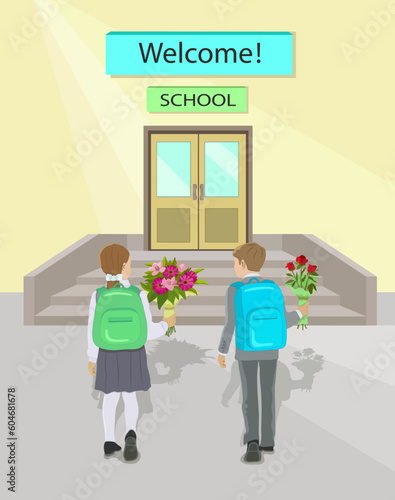 Vektorové ilustrace kreslených postaviček školních dětí. Školní vzdělávací koncept designový prvek v plochém stylu.