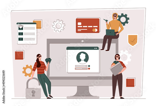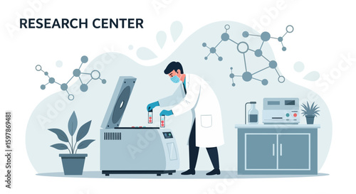 Vektorová ilustrace vědce při pohledu mikroskopem v plochém stylu. Laboratorní interiér a vybavení. Vědecký výzkum koncept konstrukční prvek.