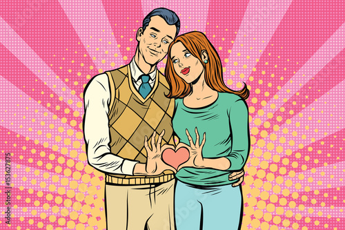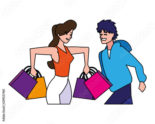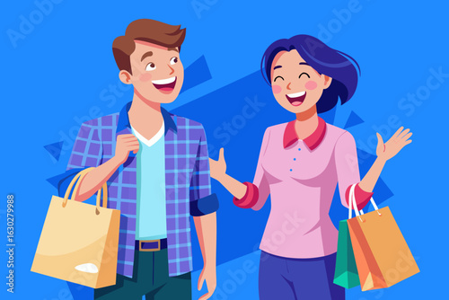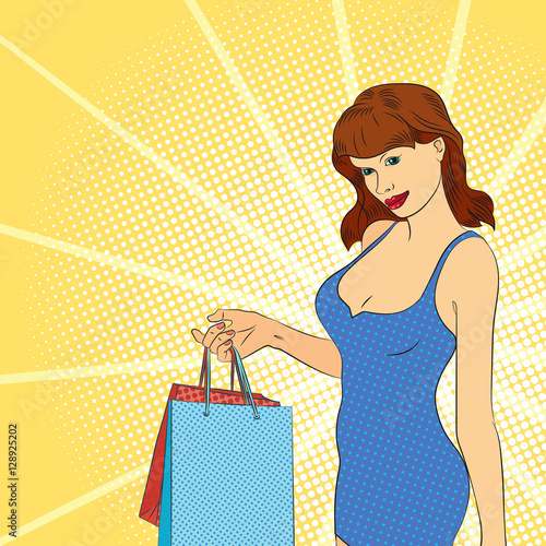 Vektorová ilustrace muže a ženy s taškami v retro pop art komickém stylu. Pár spolu mluví. Bublina. Dáma ukazuje mince na dlani. Nákupní koncept.