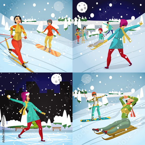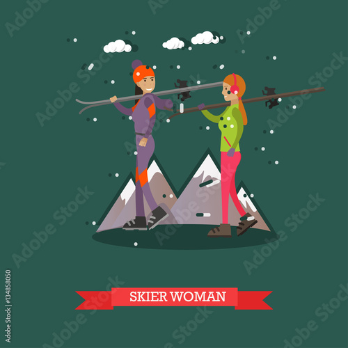Vektorová ilustrace lyžařských žen s lyžemi, které spolu mluví. Animace. Zimní sporty a rekreace koncept designový prvek v plochém stylu.