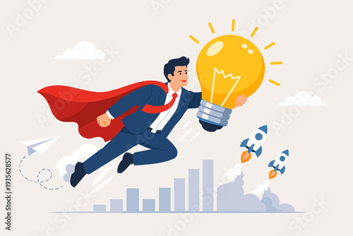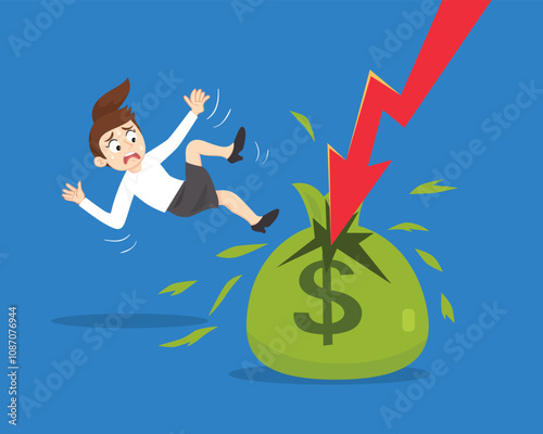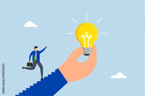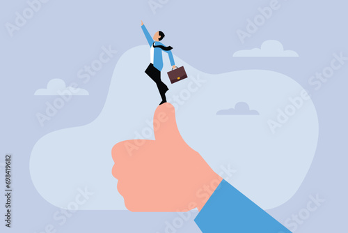 Vektorová ilustrace ukazováčku ukazujícího na úspěšného podnikatele stojícího na vrcholu schodů peněz. V ruce drží pohár. Obchodní úspěch koncept designový prvek v plochém stylu