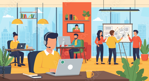 Vektorová ilustrace turistů se zavazadly po příjezdu. Jeden turista se dívá na mapu. Travel by air concept designový prvek v plochém stylu.