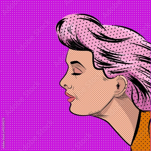 Vektorová ilustrace elegantní ženy v klobouku v retro pop art komickém stylu. Bublina.