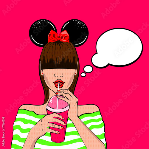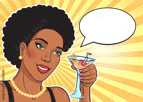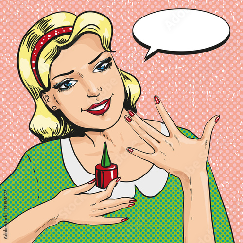Vektorová ilustrace ženy ukazující levou ruku s manikúrou a držící červený lak na nehty v pravé ruce. Retro pop art komický styl. Bublina.