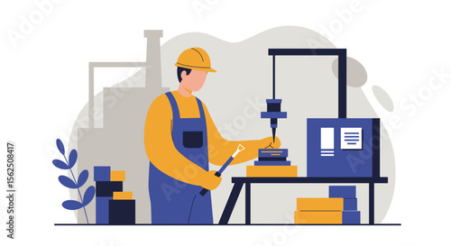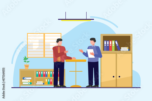Vektorová ilustrace mladého muže pracujícího u počítače. Interiér pracoviště a kreslená postavička v plochém designu.