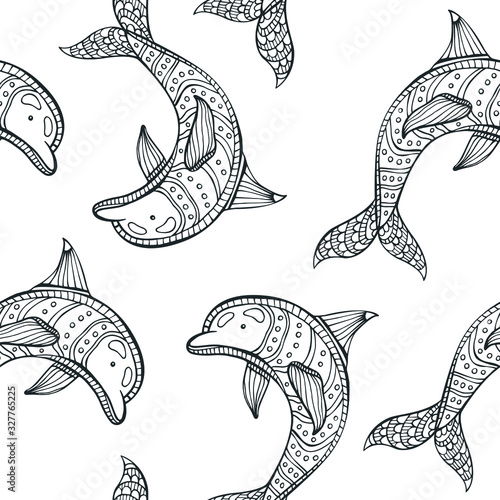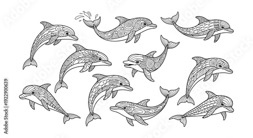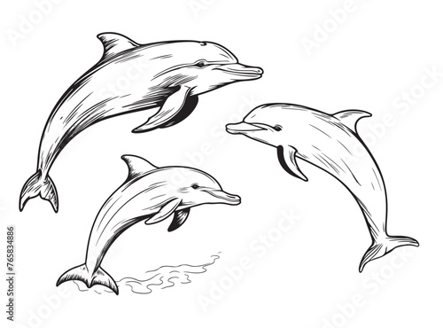 Sada ikon delfínů. Vektorové inkoust ručně kreslené ilustrace izolovaných na bílém pozadí.