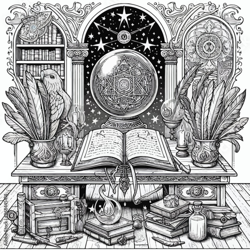 Vektorový inkoust ručně kreslený styl buddhistických písem s Tripitakou a symbolem buddhismu osmipaprskové dharmachakry. Vintage skica ilustrace.