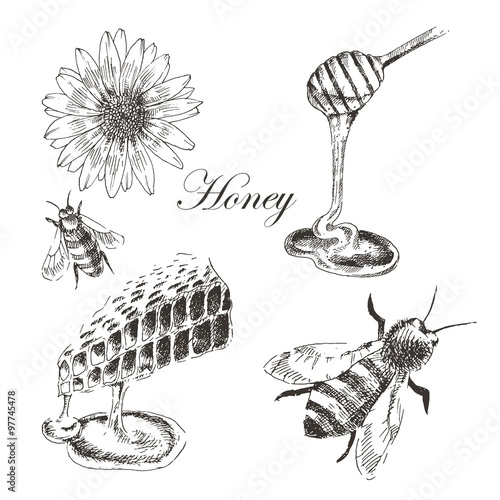 Vektorové inkoust ručně tažené med set. Voštiny s medem, úl, včela, dřevěná hůl, květina, med jar. Sladké přírodní organické med vintage skica ilustrace.