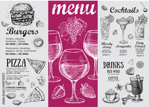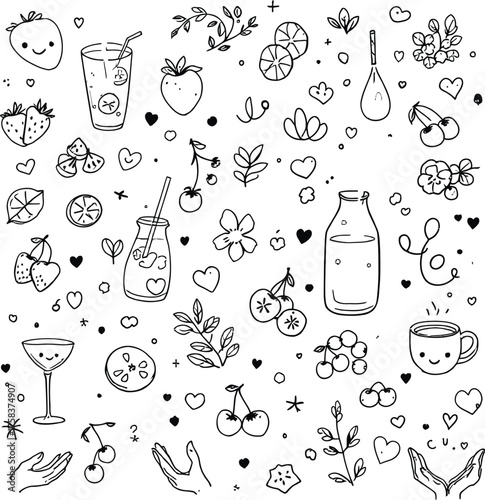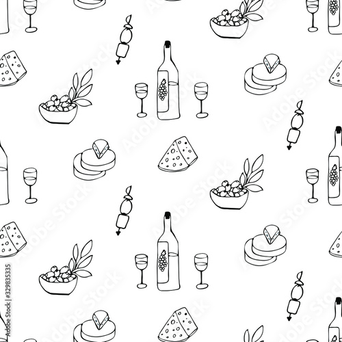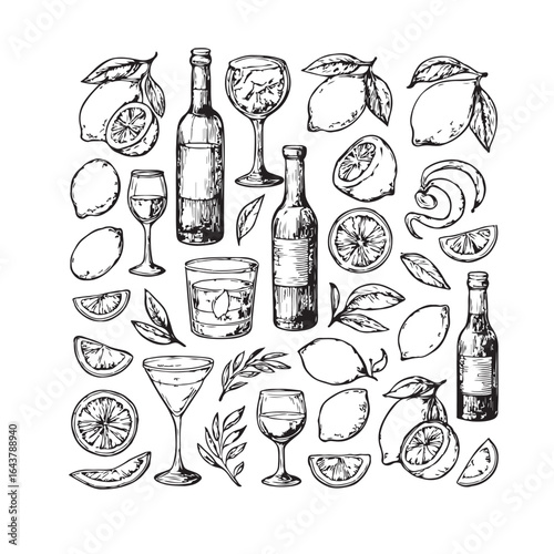 Vektorové inkoust ručně kreslené styl ilustrace bílého vína objektů pro menu, recept. Láhev vína, sklenka vína, hroznové víno, jablko, hruška a sýr izolované na bílém pozadí.