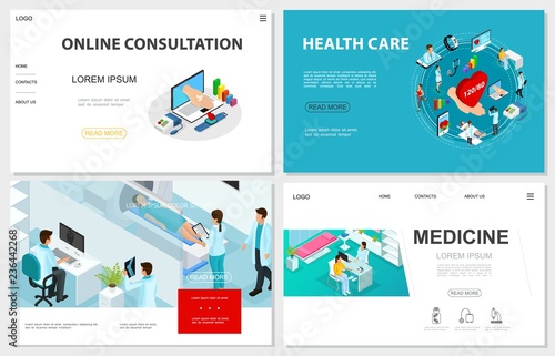 Vektorová izometrická horizontální banner sada s lékařskými, domácími, hotelovými a restauračními roboty, kteří pomáhají nebo slouží lidem a kopírují prostor.