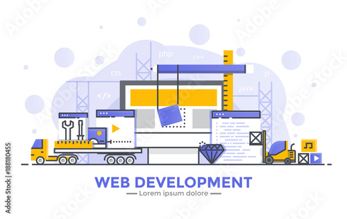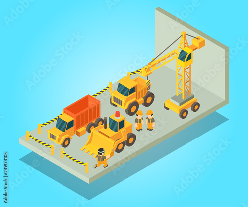 Počáteční mechanismus nabídky mincí prodeje nově vydaných tokenů výměnou za zavedené kryptoměny. Vektorový izometrický Věžový jeřáb a nákladní automobily s tokeny ico a Bitcoinovými litecoinovými etherovými mincemi.