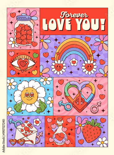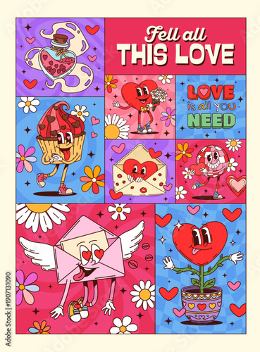 Kids birthday party Pozvánka vektorová šablona s ručně kreslenými vtipné a roztomilé postavy, sladkosti, dort, dárkové krabičky, party dekorace a ruční nápisy.