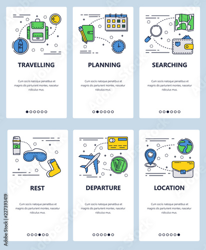 Vektorová sada mobilních aplikací na palubních obrazovkách. Podnikatelský nápad, pracovní postup, investiční taška, Finance, dokumenty, webové šablony vývojového diagramu a bannery. Tenké linie art style design ikony pro menu webových stránek.