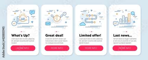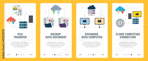 Vektorová sada vertikálních bannerů se synchronizací, distribuovanou databází, globální sítí, chybou připojení, odepřeným přístupem na webové stránky a šablonami mobilních aplikací. Moderní tenká linie plochý styl designu.