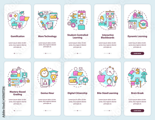 Vektorová sada mobilních aplikací onboarding obrazovky. Plán, Recenze, řízení, proces, koordinace, plán webových šablon a bannerů. Ikony designu ve stylu tenké čáry pro nabídku webových stránek.