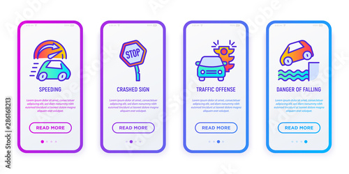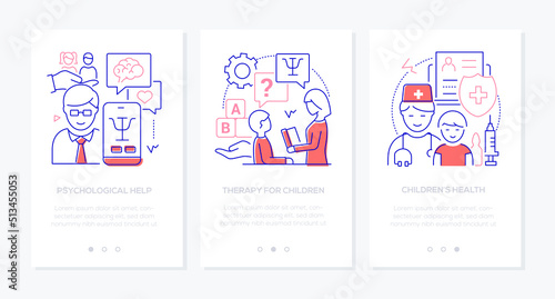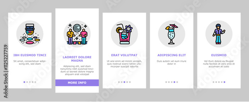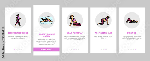 Vektorová sada mobilních aplikací onboarding obrazovky. Inovace, týmová práce, strategie, analýza, prodej, správa webových šablon a bannerů. Ikony designu ve stylu tenké čáry pro nabídku webových stránek.