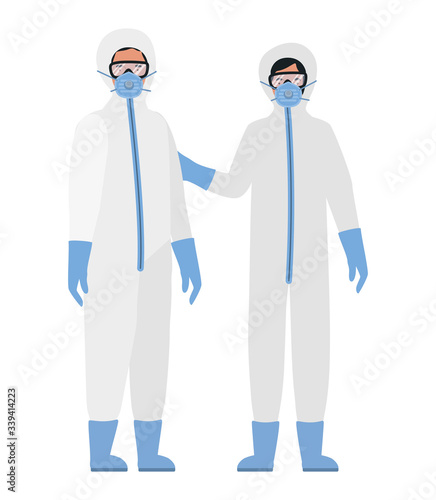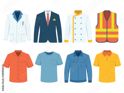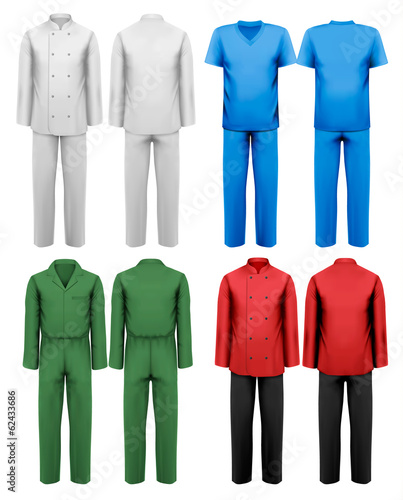 Vektorová sada lékařských uniforem pro všechny zdravotnické pracovníky. Lékaři šaty nebo laboratorní plášť, ošetřovatelská Uniforma, lékařský peeling a klobouk, chirurgická maska izolovaných na bílém pozadí.