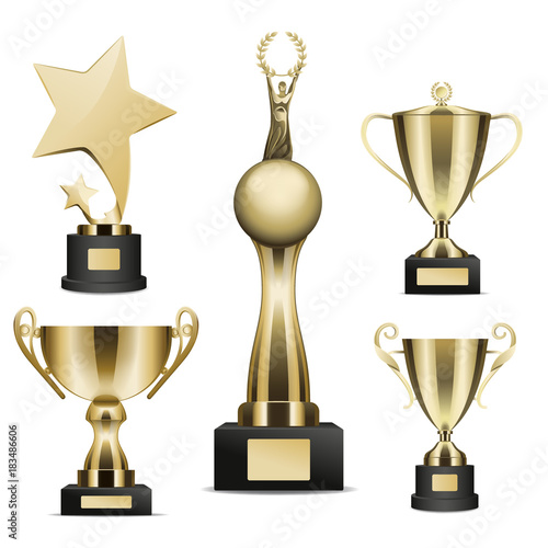 Vektorové sada kovových ocenění poháry. Realistické ikony zlatých trofejí. Sportovní a firemní ocenění.