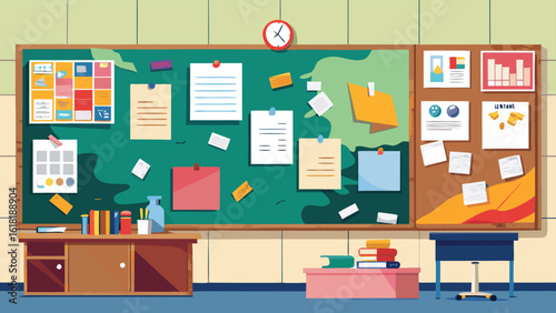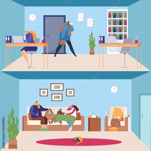 Vektorová sada moderních interiérů pracovního prostoru s kancelářským nábytkem a vybavením. Kabinet, recepce, obchodní situace, ilustrace plochého stylu.