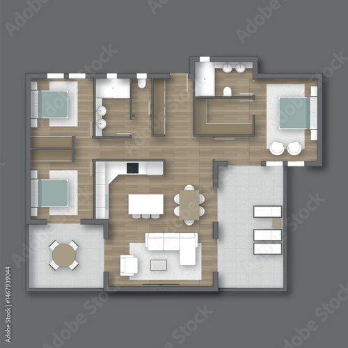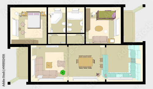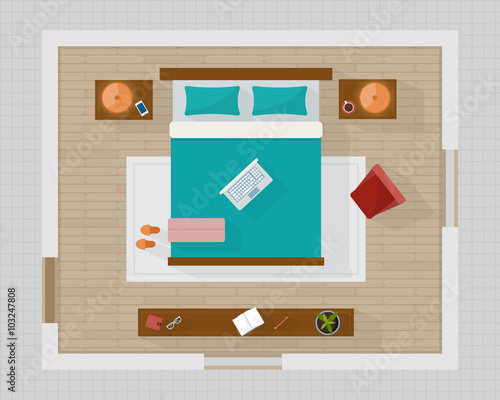 Vektorový pohled shora barevný architektonický půdorys bytu s jednou ložnicí. Moderní jídelna, ložnice a koupelna interiér s nábytkem.