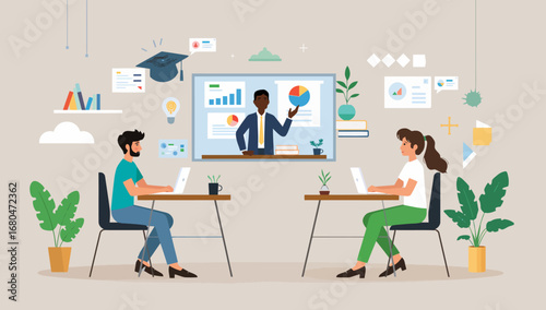 Vector office interiér banner v plochém stylu designu. Podnikatelé a administrativní pracovníci.