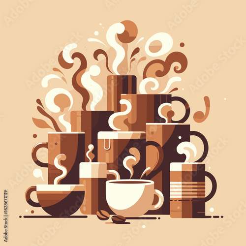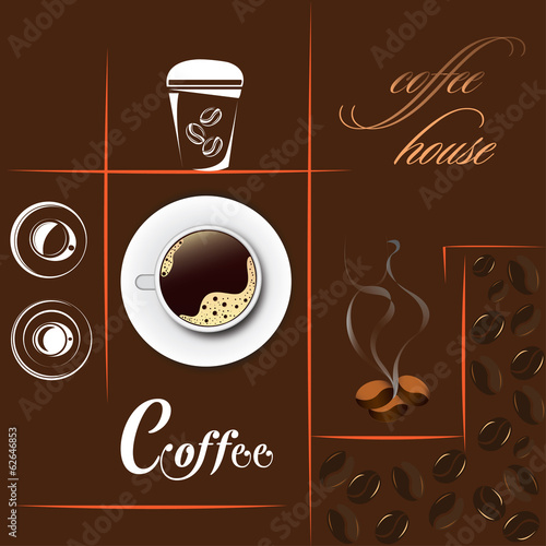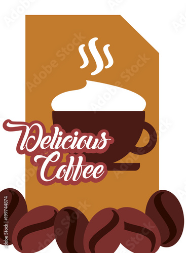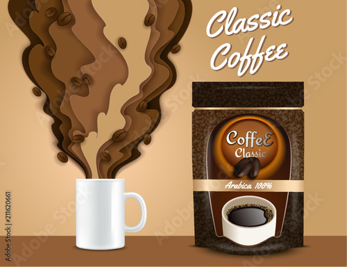 Vektorový papír řezaný šálek horké aromatické kávy s postříkáním kávy a fazolemi, sáček na balení kávy flexibilní stojící pouzdro na zip. 3D plakát na kávu, banner, šablona návrhu letáku.
