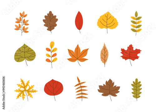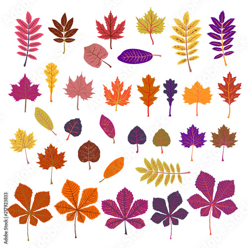Papír řezané podzimní listí. Vektorové ilustrace krásné vícebarevné javor, dub, jeřáb, bříza a další listy izolovaných na bílém pozadí.