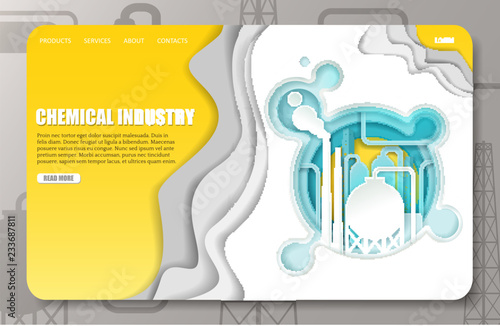 Šablona webových stránek pro vstupní stránku chemického průmyslu. Vektorový papír řezané chemické zařízení a kouření potrubí.