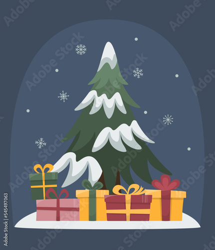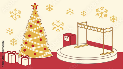 Bílý displej podium maketa set s dárkové krabičky, papír řezané vánoční strom a dekorace, vektorové ilustrace. Vánoční scéna pro zimní dovolenou dárky, propagace kosmetických výrobků.