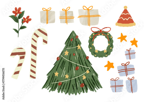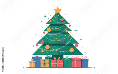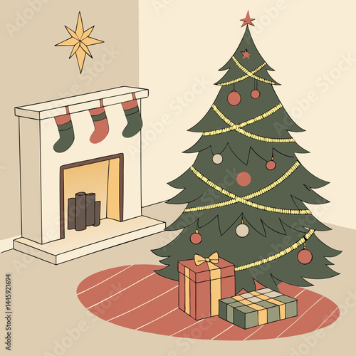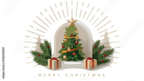 Bílý displej podium maketa set s dárkové krabičky, papír řezané vánoční strom a dekorace, vektorové ilustrace. Vánoční scéna pro zimní dovolenou dárky, propagace kosmetických výrobků.