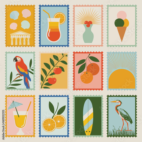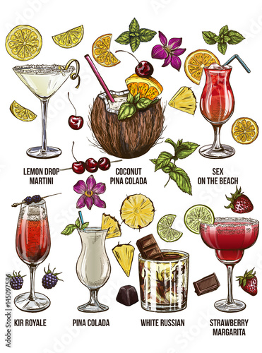 Sada koktejlových letních nápojů. Vektorové papír řez ilustrace. Tropical party Pozvánka plakát design šablony s krásnými exotickými tropickými květinami, palmovými listy a koktejly.