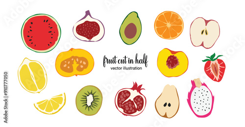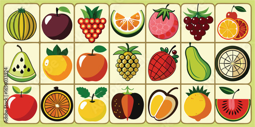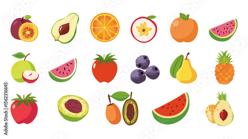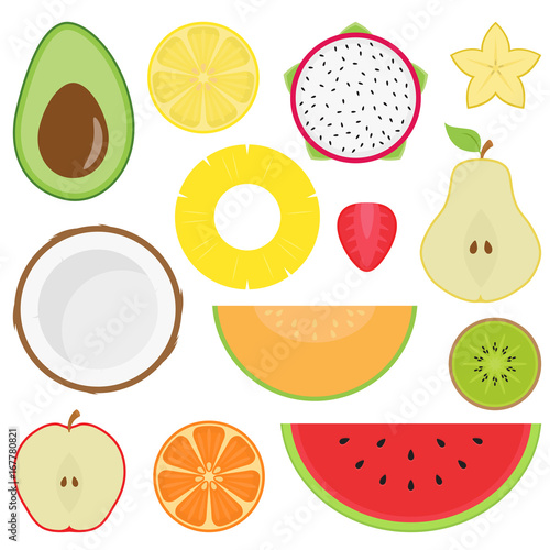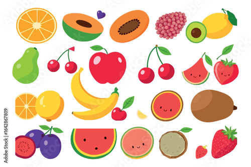 Vektorový papír řez řemeslný styl čerstvé letní ovoce a bobule. Sladký plátek melounu, jablko, švestka, hruška, třešeň, kiwi, pomeranč, limetka, granátové jablko, jahody a tropické ovoce. Zdravá strava.
