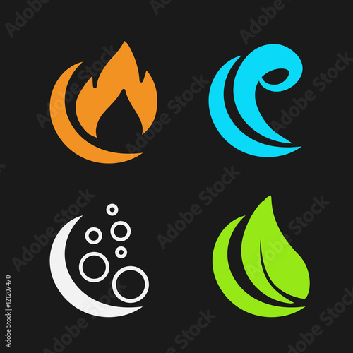 Čtyři prvky přírodních symbolů. Vektorový papír řez plamen, kapka vody, obloha s mraky a listy v kruhu.