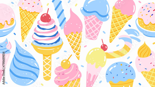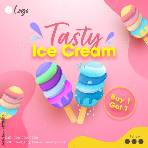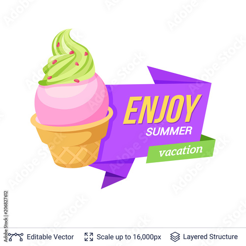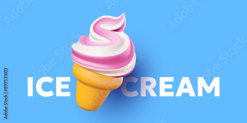Ovoce zmrzlina plakát banner design šablony. Vektorový papír řez zmrzlina kužel s ovocnou šťávou šplouchá a čerstvé starwberry, třešeň, plátky kiwi, vápno, mango, pomeranč.