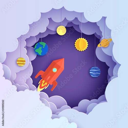 Šablona webových stránek vstupní stránky cesty do vesmíru. Vektorový papír snížit raketový start, nebe, planety, hvězdy. Koncept vesmírné cesty, styl papírového umění.