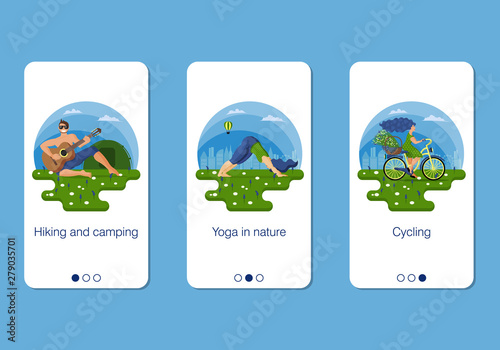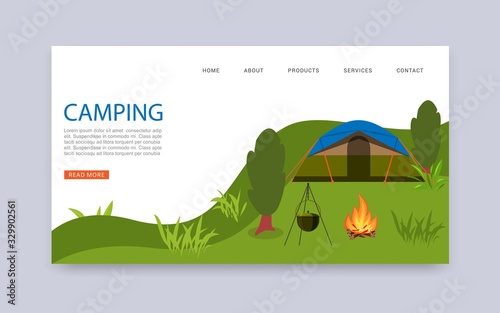 Šablona webových stránek vstupní stránky letního tábora. Vektorový papír řez ilustrace táboráku a stanu u jezera na lesním a horském pozadí. Letní kempování, turistika, trekking koncept.