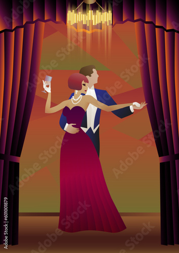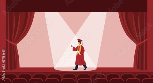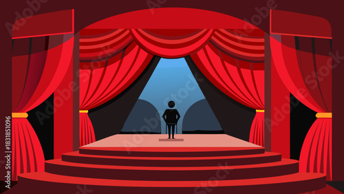 Divadelní představení plakát banner šablona. Vektorové papírové řezané divadelní jeviště s červenými závěsy, reflektory a siluety herců.