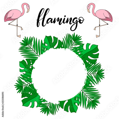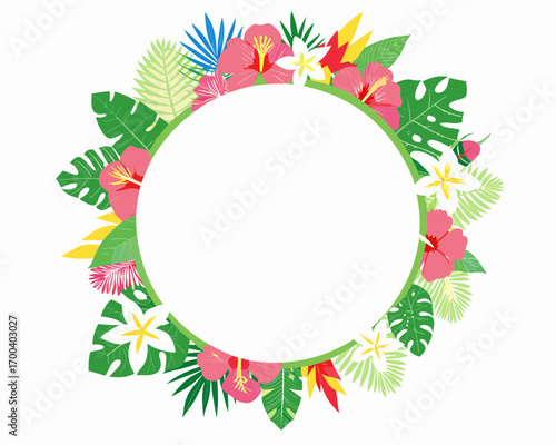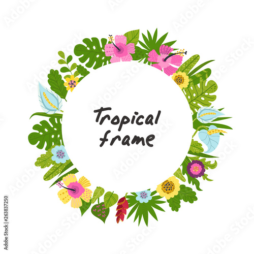 Tropický koktejl letní nápoj kulatý rám. Vektorové papírové řezané ilustrace krásných exotických tropických květin, palmových listů a koktejlů.