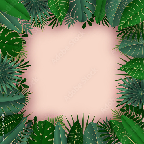 Šablona tropického květinového rámu. Vektorový papír řez dekorativní čtvercový letní rám s krásnými exotickými tropickými květinami, palmovými listy.
