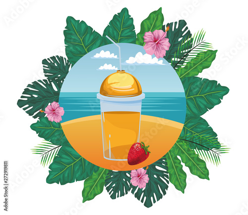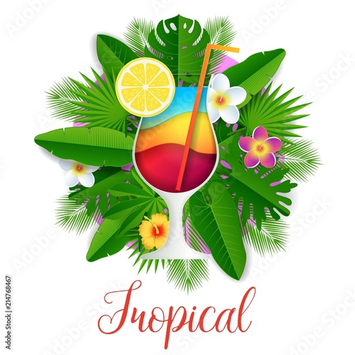 Tropické vektorové papír řez ilustrace. Exotické květiny, palmové listy a sklenice koktejlu s plátkem citronu. Letní pláž tropická strana pozvánka, karta, plakát, šablona návrhu banneru.