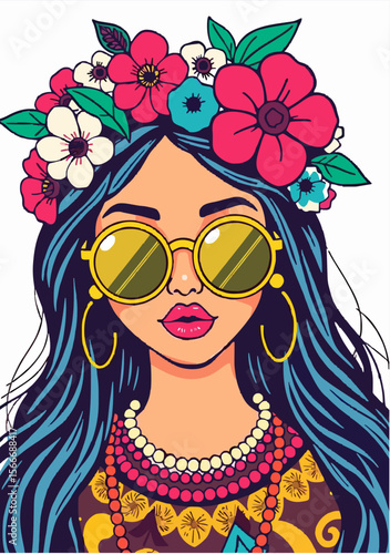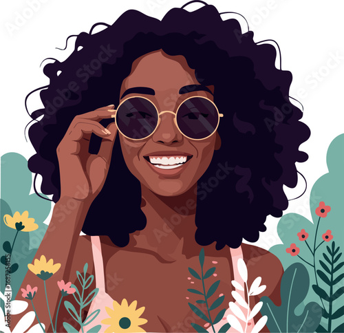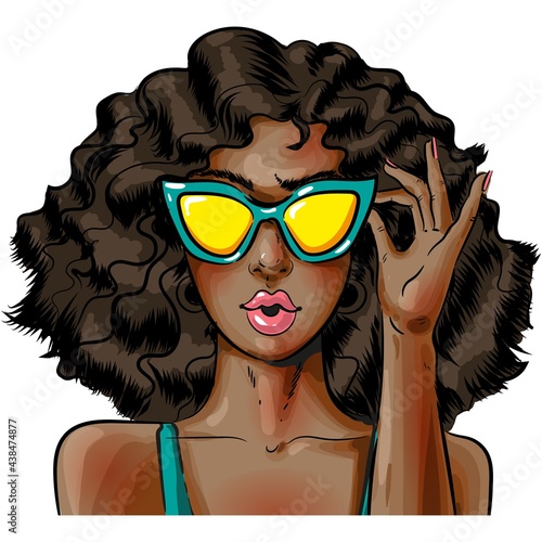 Vektorová ilustrace mladé Afroameričanky ve žlutých slunečních brýlích. Sexy pin-up dívka v pop art retro komický styl.